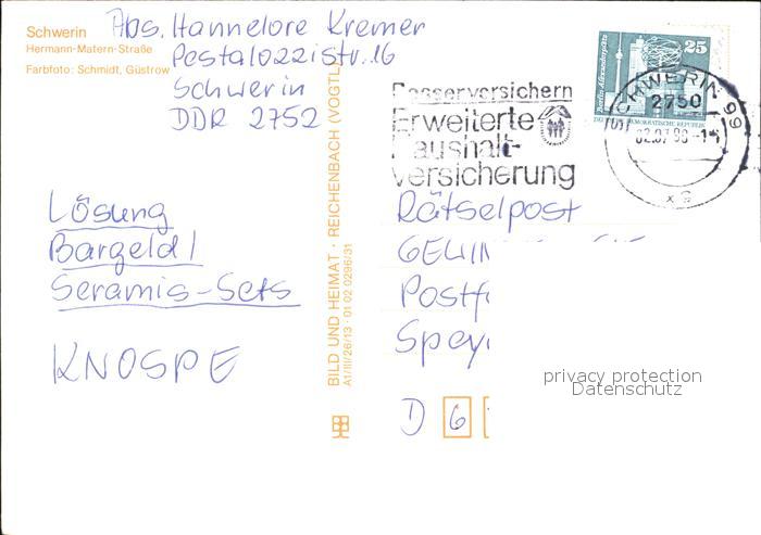 72391271 alte Postkarte Schwerin Mecklenburg Hermann Matern Strasse postalisch gelaufen Erhaltung siehe scans KatCode: 11110013004000