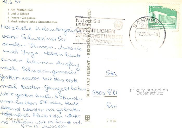 73072041 alte Postkarte Schwerin Mecklenburg Pfaffenteich Schloss Ziegelsee postalisch gelaufen Erhaltung siehe scans [NatalD47] KatCode: 11110013004000