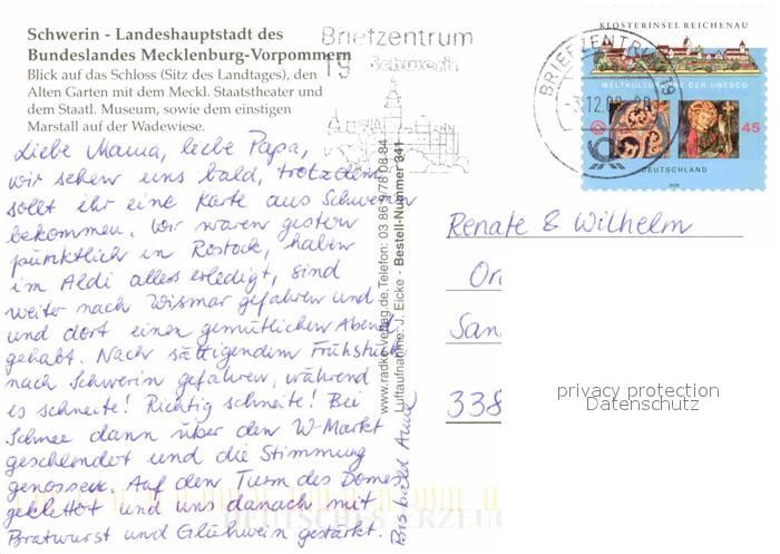 72711689 alte Postkarte Schwerin Mecklenburg Schloss Alter Garten Staatstheater Museum Marstall Wagewiese Schweriner See Fliegeraufnahme postalisch gelaufen Erhaltung siehe scans [FriedD77] KatCode: 11110013004000
