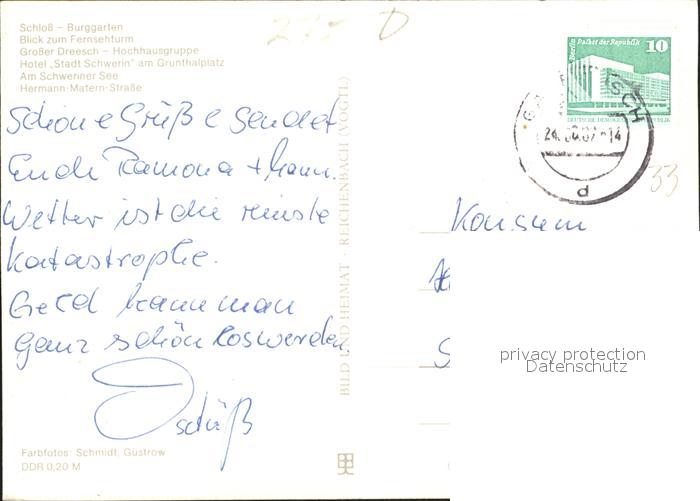 72331441 alte Postkarte Schwerin Mecklenburg Schloss Burggarten Fernsehturm Hermann-Matern-Strasse postalisch gelaufen Erhaltung siehe scans KatCode: 11110013004000