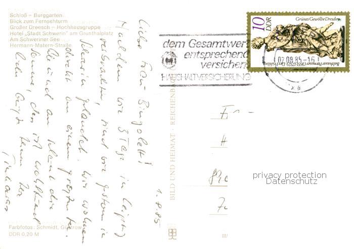 73830441 alte Postkarte Schwerin Mecklenburg Schloss Burggarten Fernsehturm Hochhausgruppe Hotel Stadt Schwerin Schweriner See Hermann Matern Strasse postalisch gelaufen Erhaltung siehe scans [WerneD78] KatCode: 11110013004000