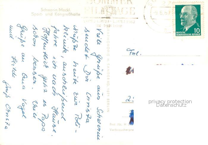 73722432 alte Postkarte Schwerin Mecklenburg Sport und Kongresshalle postalisch gelaufen Erhaltung siehe scans [WerneD78] KatCode: 11110013004000