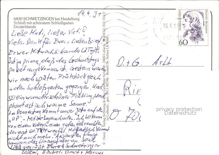 72329041 alte Postkarte Schwetzingen Fliegeraufnahme Schloss mit Schlossgarten postalisch gelaufen Erhaltung siehe scans KatCode: 11110008226084
