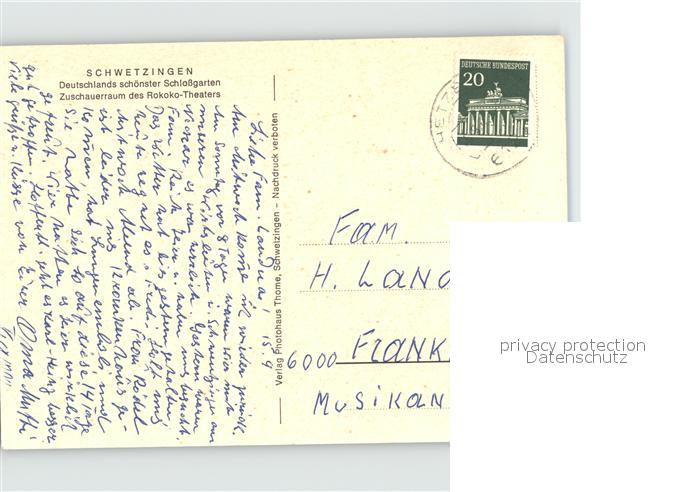 72431829 alte Postkarte Schwetzingen Rokoko-Theater postalisch gelaufen Erhaltung siehe scans KatCode: 11110008226084