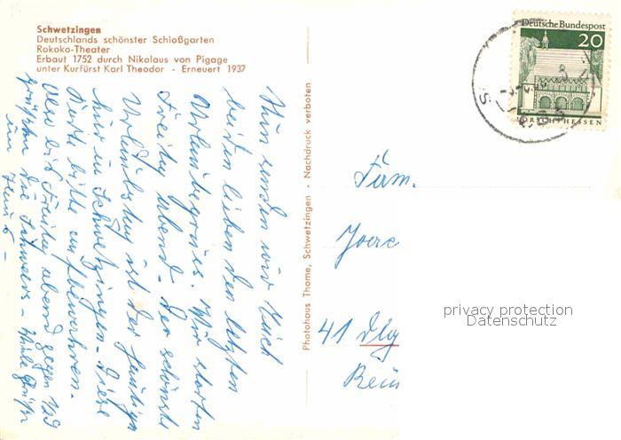 72831919 alte Postkarte Schwetzingen Rokoko Theater Erbauer Nikolaus von Pigage 18. Jhdt. postalisch gelaufen Erhaltung siehe scans [FriedD77] KatCode: 11110008226084