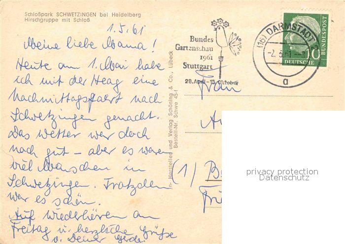 72846502 alte Postkarte Schwetzingen Schloss Hirschgruppe postalisch gelaufen Erhaltung siehe scans [KathaD81] KatCode: 11110008226084