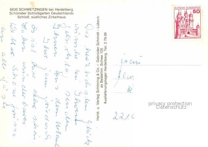 72746045 alte Postkarte Schwetzingen Schloss suedliches Zirkelhaus Schlossgarten postalisch gelaufen Erhaltung siehe scans [FriedD77] KatCode: 11110008226084