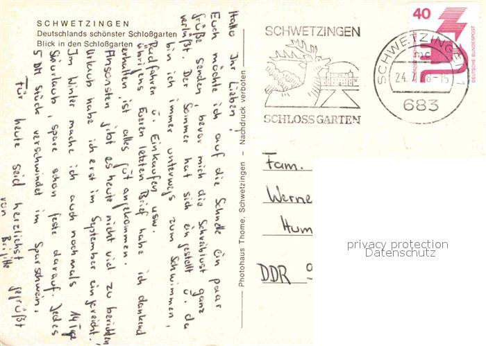 72616756 alte Postkarte Schwetzingen Schlossgarten postalisch gelaufen Erhaltung siehe scans [WerneD78] KatCode: 11110008226084