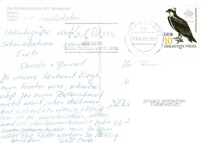 72650910 alte Postkarte Schwielochsee Niewisch Pieskow Leissnitz Badestrand Segelboot postalisch gelaufen Erhaltung siehe scans [FriedD77] KatCode: 11110012061450