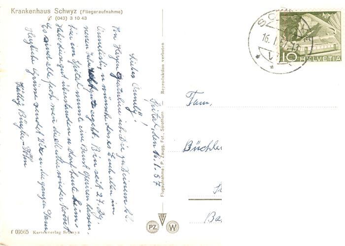 13934864 alte Postkarte Schwyz SZ Krankenhaus Schwyz Fliegeraufnahme postalisch gelaufen Erhaltung siehe scans [FriedD77] KatCode: 11470170500524