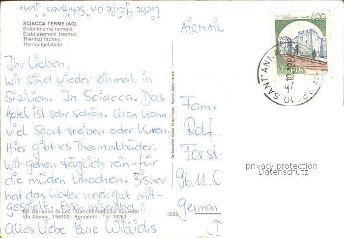 old postcard Sciacca Agrigento Thermalgebaeude Palmen postalisch gelaufen Erhaltung siehe scans