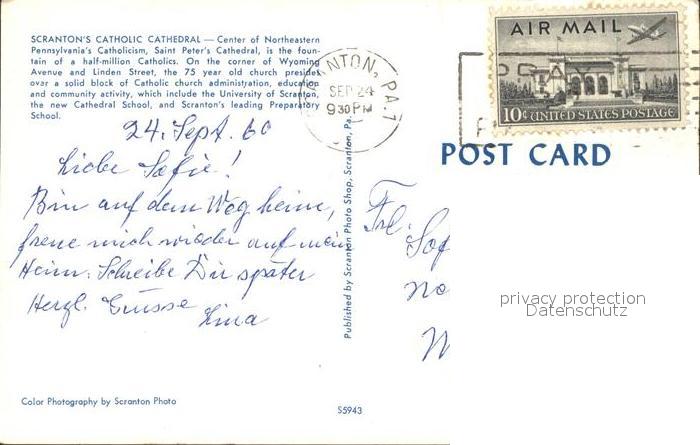 72312215 old postcard Scranton Pennsylvania Catholic Cathedral postalisch gelaufen Erhaltung siehe scans KatCode: 14140410000000