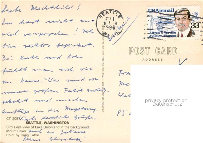 73746351 old postcard Seattle Fliegeraufnahme mit Mt Baker postalisch gelaufen Erhaltung siehe scans [FriedD77] KatCode: 14140500000000