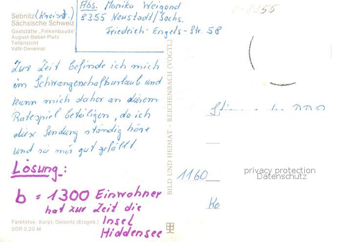 73040953 alte Postkarte Sebnitz Gaststaette Finkenbaude Aug Bebel Platz Stadtblick VdN Denkmal postalisch gelaufen Erhaltung siehe scans [WerneD78] KatCode: 11110014287370