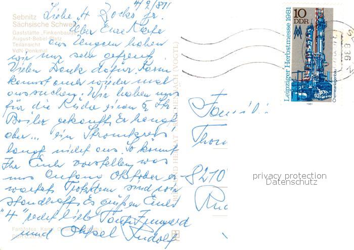 73090609 alte Postkarte Sebnitz Gaststaette Finkenbauer August Bebel Platz VdN Denkmal postalisch gelaufen Erhaltung siehe scans [KathaD81] KatCode: 11110014287370