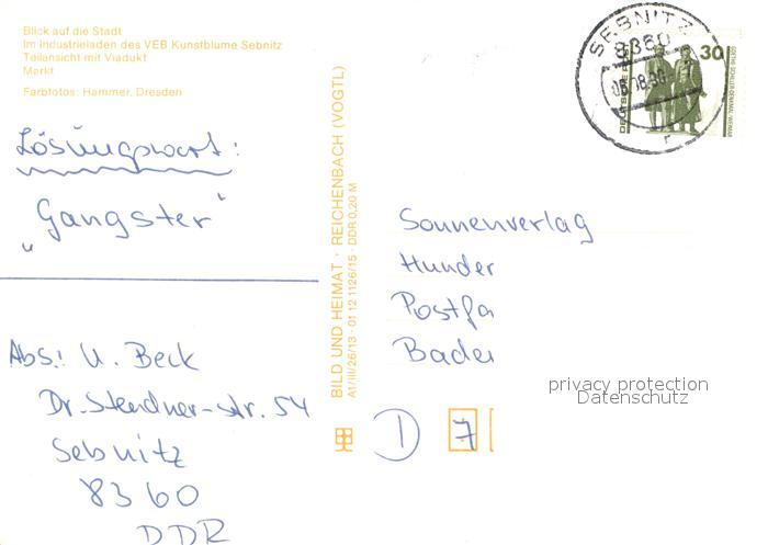 73652203 alte Postkarte Sebnitz Stadtblick Industrieladen des VEB Kunstblume Teilansicht mit Viadukt Markt postalisch gelaufen Erhaltung siehe scans [WerneD78] KatCode: 11110014287370
