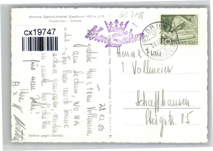 10738093 alte Postkarte Sedrun Krone Sport Hotel postalisch gelaufen KatCode: 11470100355538