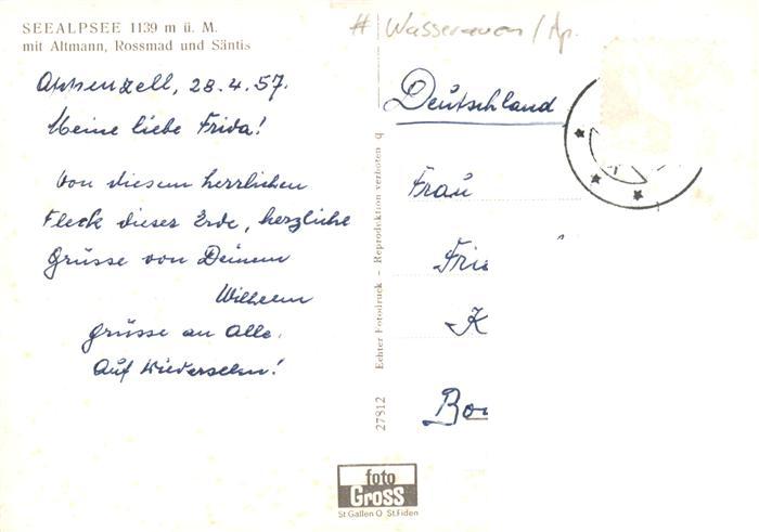 13895125 alte Postkarte Seealpsee Saentis IR Alphornblaeser am Seealpsee mit Altmann Rossmad und Saentis Appenzeller Alpen postalisch gelaufen Erhaltung siehe scans [FriedD77] KatCode: 11470030075604