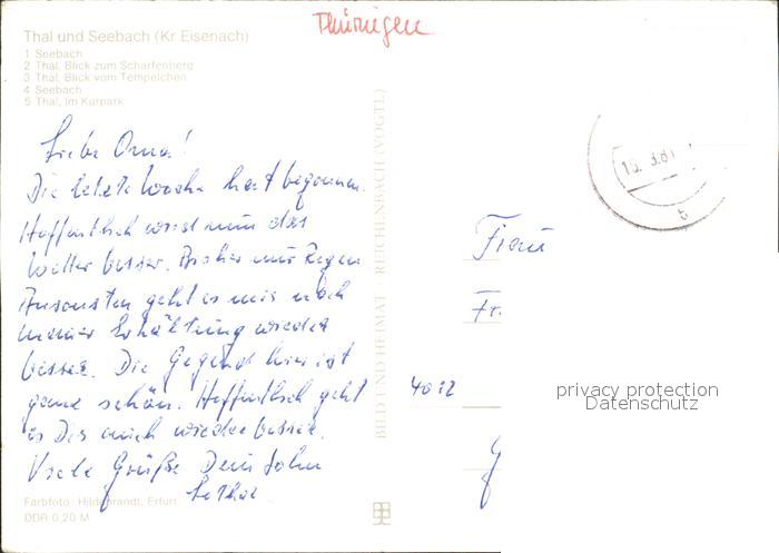 72324056 alte Postkarte Seebach Eisenach Teilansichten und Thal mit Scharfenberg Tempelchen Kurpark postalisch gelaufen Erhaltung siehe scans KatCode: 11110016063071
