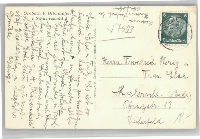 40712138 alte Postkarte Seebach Ottenhoefen Schwarzwald postalisch gelaufen KatCode: 11110008317102
