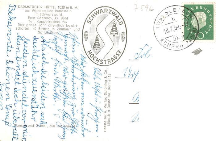 73902452 alte Postkarte Seebach Ottenhoefen Schwarzwald Darmstaedter Huette mit Wildsee und Ruhestein postalisch gelaufen Erhaltung siehe scans [FriedD77] KatCode: 11110008317102
