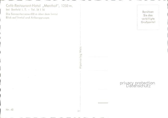 72612201 Seefeld Tirol Cafe Restaurant Hotel Menthof postalisch nicht gelaufen Erhaltung siehe scans [AndreD76] KatCode: 11390332070351