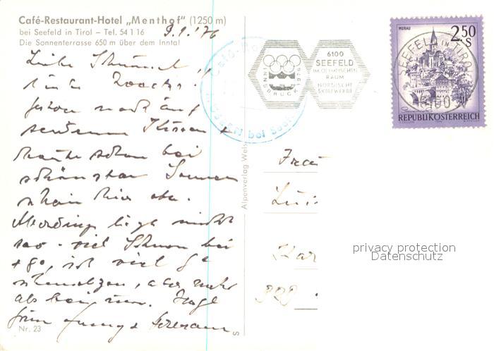 73683224 alte Postkarte Seefeld Tirol Cafe Restaurant Hotel Menthof postalisch gelaufen Erhaltung siehe scans [WerneD78] KatCode: 11390332070351