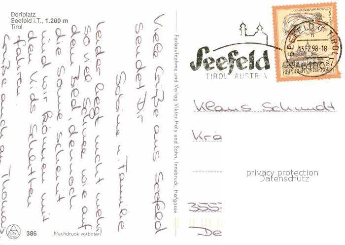 72865599 alte Postkarte Seefeld Tirol Dorfplatz mit Kirche postalisch gelaufen Erhaltung siehe scans [WerneD78] KatCode: 11390332070351