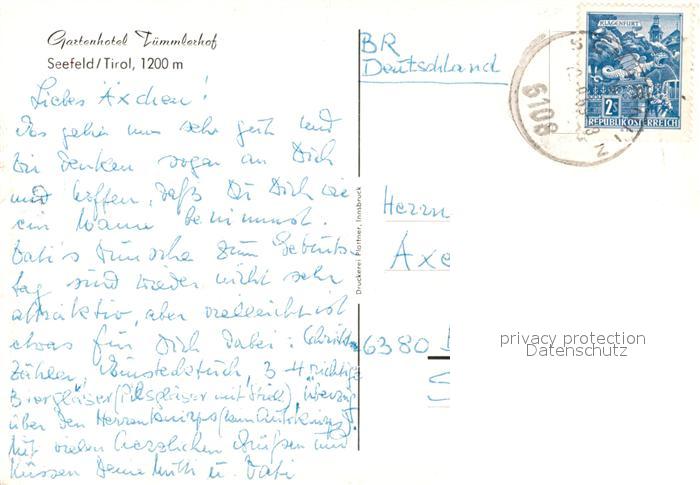 73160481 alte Postkarte Seefeld Tirol Gartenhotel Tuemmlerhof postalisch gelaufen Erhaltung siehe scans [LiesaD40] KatCode: 11390332070351