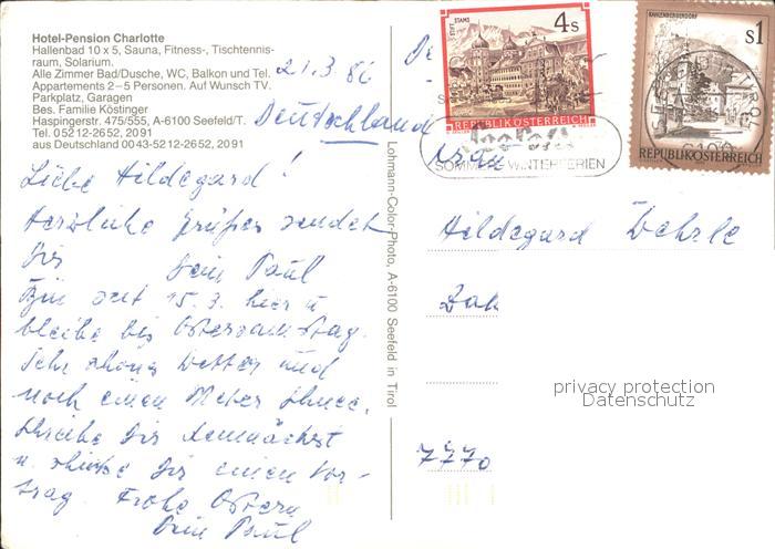 71960058 alte Postkarte Seefeld Tirol Hotel Charlotta postalisch gelaufen Erhaltung siehe scans KatCode: 11390332070351