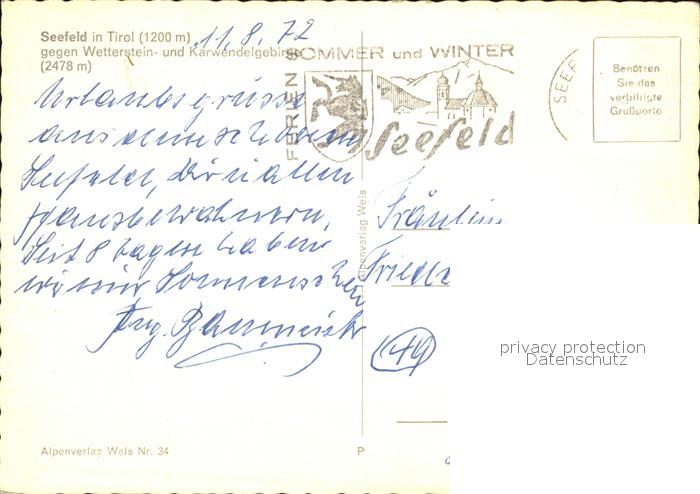 72603599 alte Postkarte Seefeld Tirol Kirche Blick gegen Wetterstein und Karwendelgebirge postalisch gelaufen Erhaltung siehe scans [FriedD77] KatCode: 11390332070351