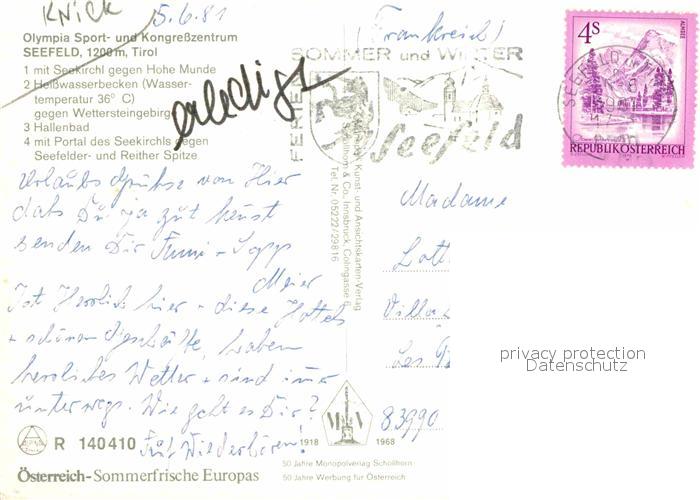 72673365 alte Postkarte Seefeld Tirol Olympia Sport und Kongresszentrum Seekirchl Hohe Munde Freibad Hallenbad Alpenpanorama postalisch gelaufen Erhaltung siehe scans [FriedD77] KatCode: 11390332070351
