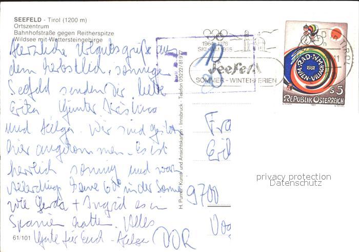 72517944 alte Postkarte Seefeld Tirol Ortszentrum Bahnhofstrasse mit Reitherspitze Wildsee postalisch gelaufen Erhaltung siehe scans KatCode: 11390332070351