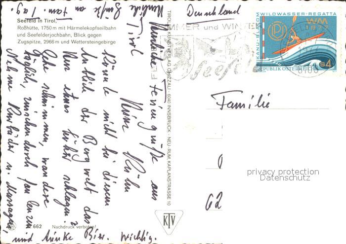71960079 alte Postkarte Seefeld Tirol Rosshuette Haermelekopfseilbahn Seefelderjochbahn Zugsptze Wettersteingebirge postalisch gelaufen Erhaltung siehe scans KatCode: 11390332070351