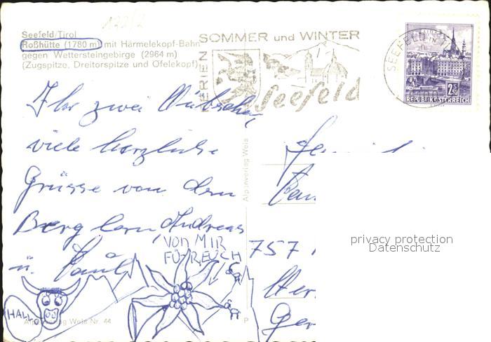 72489785 alte Postkarte Seefeld Tirol Rosshuette mit Haermelekopf Wettersteingebirge Zugspitze postalisch gelaufen Erhaltung siehe scans KatCode: 11390332070351