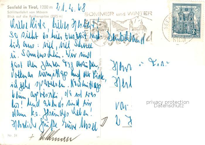 73779663 alte Postkarte Seefeld Tirol Schlittenfahrt von Moesern mit Reitherspitze postalisch gelaufen Erhaltung siehe scans [WerneD78] KatCode: 11390332070351