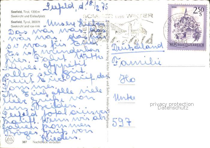 72438193 alte Postkarte Seefeld Tirol Seekirchel und Eislaufplatz postalisch gelaufen Erhaltung siehe scans KatCode: 11390332070351
