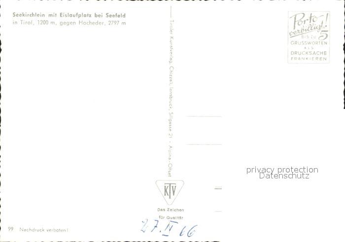72067126 Seefeld Tirol Seekirchlein mit Eislaufplatz und Hocheder postalisch nicht gelaufen Erhaltung siehe scans KatCode: 11390332070351