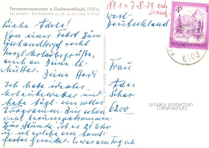 12974558 alte Postkarte Seefeld Tirol Terrassenrestaurant Gschwandtkopf postalisch gelaufen Erhaltung siehe scans [NatalD47] KatCode: 11390332070351