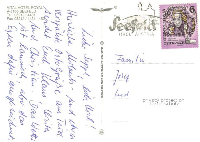73656455 alte Postkarte Seefeld Tirol Vital Hotel Royal Fliegeraufnahme postalisch gelaufen Erhaltung siehe scans [WerneD78] KatCode: 11390332070351