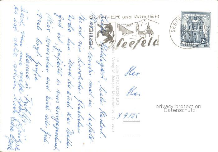72375489 alte Postkarte Seefeld Tirol Wandergebiet Moesern Holzschnitzerei Brunnen Leutasch Wildsee Alpen Rosshuette Hermelekopfbahn Pferde postalisch gelaufen Erhaltung siehe scans KatCode: 11390332070351