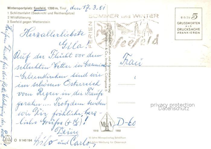 73116181 alte Postkarte Seefeld Tirol Wildfuetterung Wetterstein postalisch gelaufen Erhaltung siehe scans [NatalD47] KatCode: 11390332070351