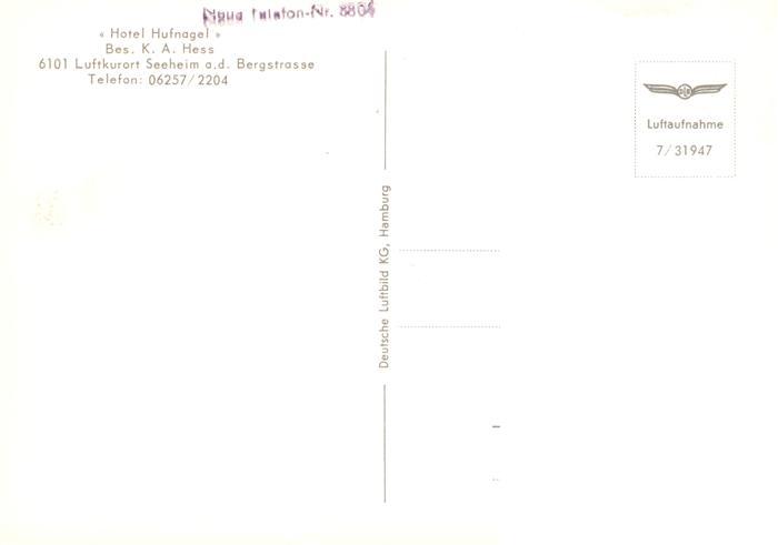 73886406 Seeheim-Jugenheim Bergstrasse Hotel Hufnagel Luftkurort postalisch nicht gelaufen Fliegeraufnahme Erhaltung siehe scans [FriedD77] KatCode: 11110006432022
