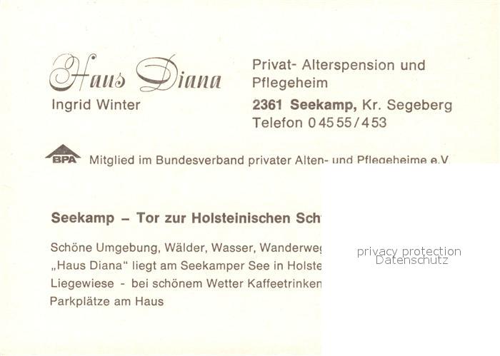 73542895 Seekamp Bad Segeberg Pension Pflegeheim Haus Diana postalisch nicht gelaufen Werbekarte (keine Postkarte) Erhaltung siehe scans [FriedD77] KatCode: 11110001060075
