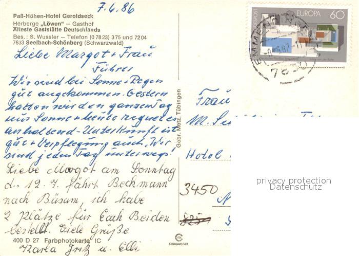 73725388 alte Postkarte Seelbach Schutter Pass Hoehenhotel Geroldseck postalisch gelaufen Erhaltung siehe scans [WerneD78] KatCode: 11110008317127