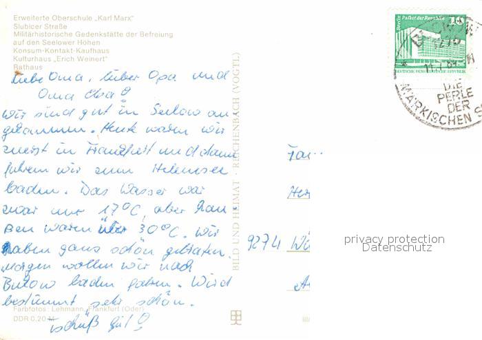 72773349 alte Postkarte Seelow Gedenkstaette der Befreiung Oberschule Karl Marx Slubicer Str Konsum Kontakt Kaufhaus Kulturhaus Erich Weinert Rathaus postalisch gelaufen Erhaltung siehe scans [FriedD77] KatCode: 11110012064448