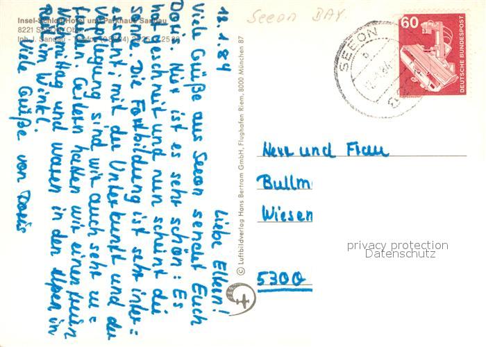 72951722 alte Postkarte Seeon-Seebruck Fliegeraufnahme Insel-Schlosshotel Parkhaus Sandau postalisch gelaufen Erhaltung siehe scans [NatalD47] KatCode: 11110009189143