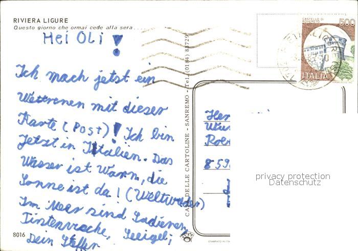 alte Postkarte Segelboote Riviera Ligure Sonnenuntergang postalisch gelaufen Erhaltung siehe scans
