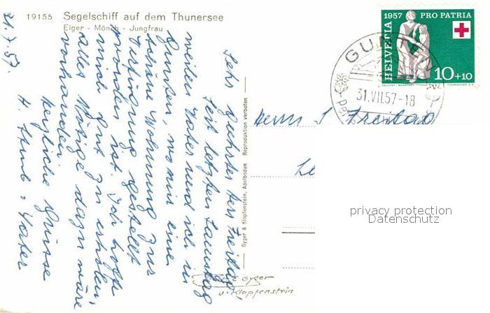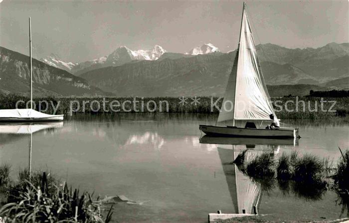 alte Postkarte Segelboote Thunersee Eiger Moench Jungfrau postalisch gelaufen Erhaltung siehe scans [PaolaD17]