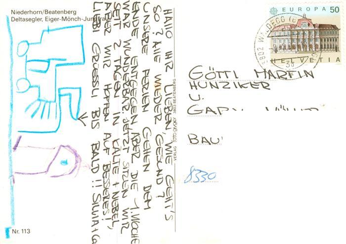74036764 alte Postkarte Segelflug Gliding Vol-Voile Vuolo-a-Vela Volo-a-Vela– Niederhorn Beatenberg Deltasegler Eiger Moench Jungfrau postalisch gelaufen Erhaltung siehe scans [IrynaD87] KatCode: 22120000000300